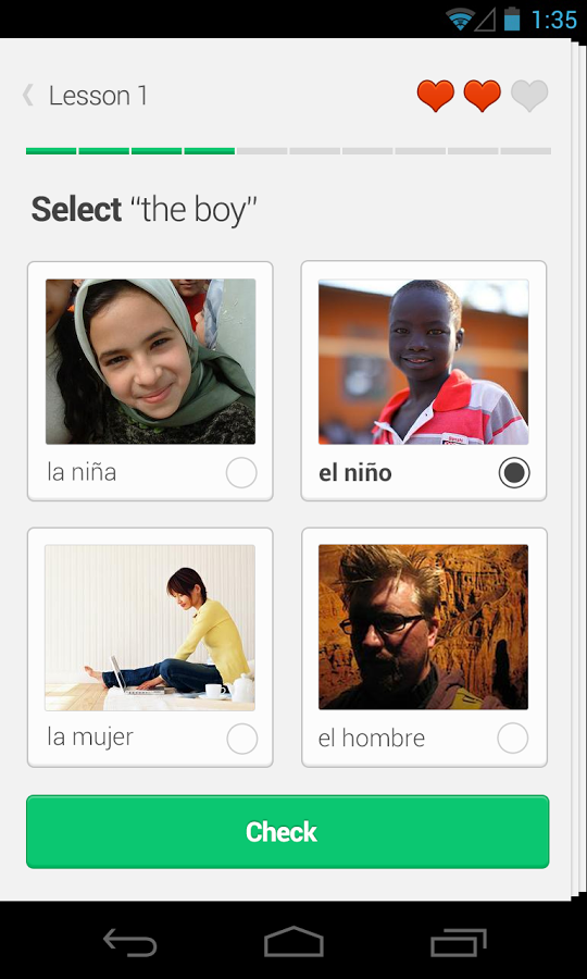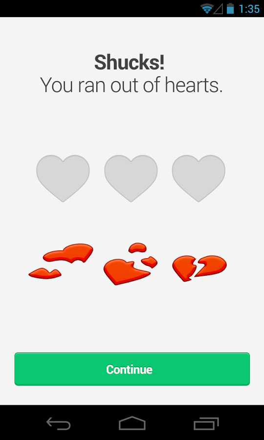- приложение устроено как игра. Продвигайтесь вперёд проходя урок за уроком, за неправильные ответы вы теряете "жизни";
