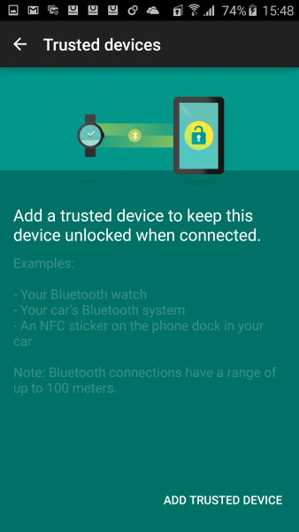 Функция Smart Lock отключает защиту и блокировку смартфона, когда устройство подключено через Bluetooth к доверенным устройствам (Смартчасы, стерео в автомобиле и т.д.), или же Вы находитесь в доверенной зоне. Она определяется только геопозиционированием, и Вы можете «добавить надежную сеть Wi-Fi”.