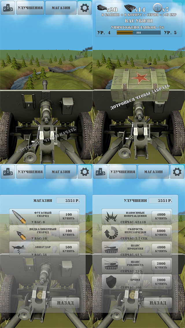К 70-летию Дня Победы в честь подвига Советских бойцов, в память о павших героях. В благодарность за Победу и Мир, родилась эта игра. За основу был взят подвиг старшего сержанта Николая Владимировича Сиротинина. Цель игры отбиваться от немецких танков, не позволяя им перебраться через реку. Если танк преодолеет реку или броня дойдет до "0" игра заканчивается.