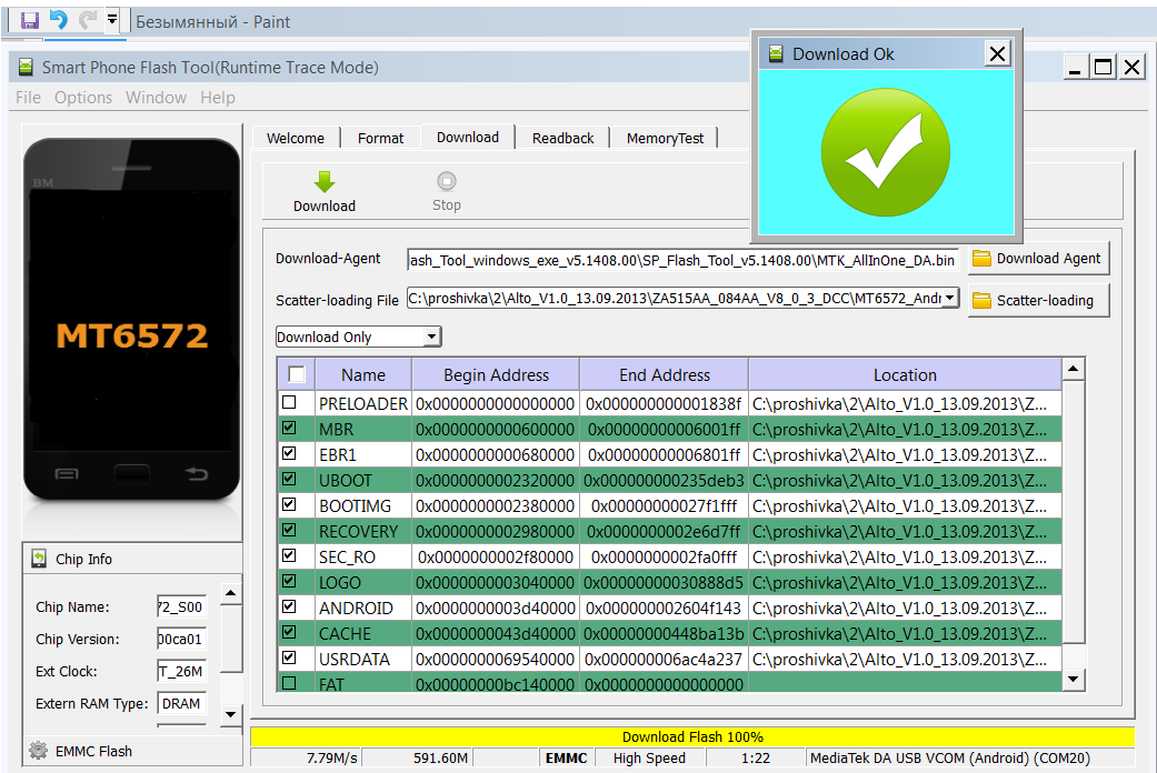 6. Дождитесь завершения прошивки, не прерывайте данный процесс. По завершению прошивки на экране Flash Tool появится небольшое окошко с зелёным кружочком, после этого можно отключить смартфон от компьютера. Вытащите и вставьте батарею еще раз и запустите смартфон как обычно, первая загрузка после перепрошивки может длиться чуть дольше обычногоCкачать: