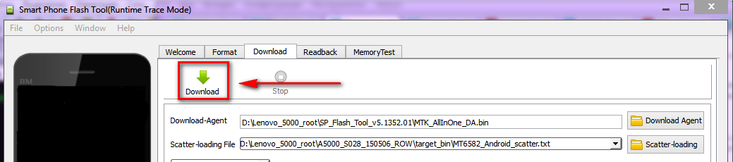 8. Нажать на кнопку Download (зелёная стрелочка вниз) и подключить выключенный телефон к компьютеру, если драйвера установлены, то сразу начнётся прошивка.