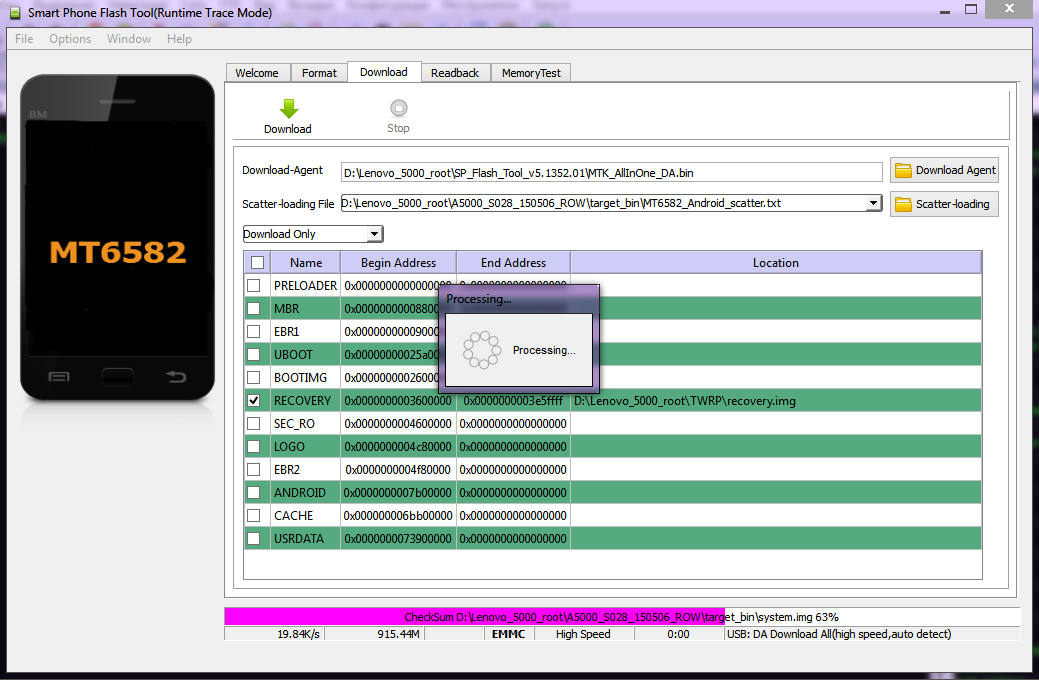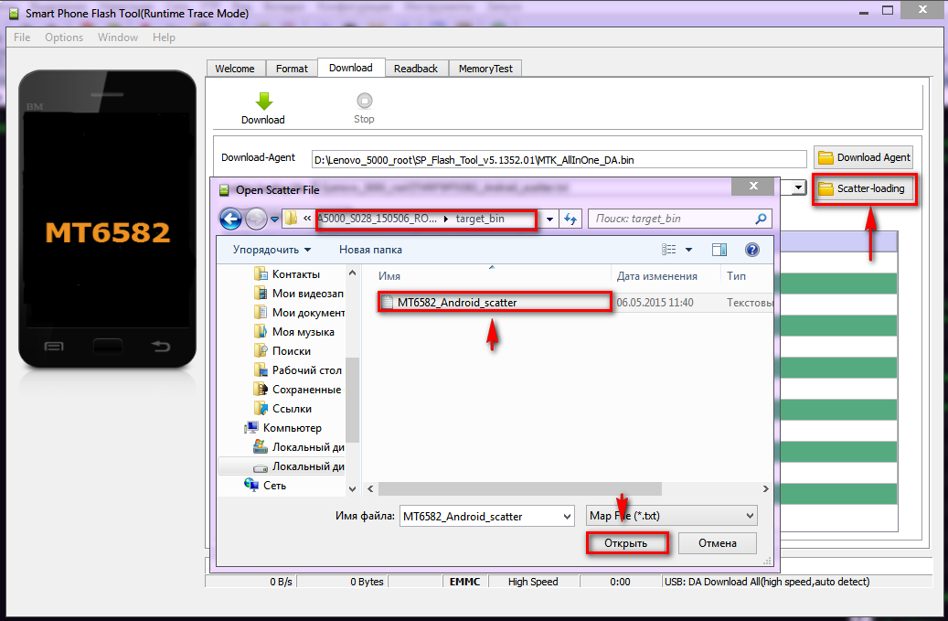 6. Нажать на кнопку scatter-loading и в открывшемся проводнике выбрать файл MT6582_Android_scatter.txt, который находится в папке target_bin с прошивкой.
