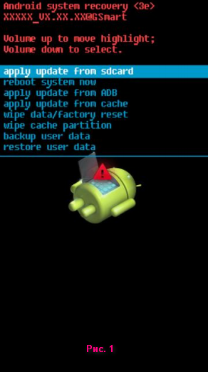 4. Дальше смартфон загрузится в режим рекавери (рис. 1). Для навигации по рекавери используйте кнопку "звук +" (чтобы передвигаться по пунктам) и кнопку "звук -" чтобы подтвердить выбор того или иного пункта.
