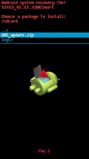 5. Выберите apply update from sdcard, а затем выберите архив GBC_update.zip, который был предварительно скопирован на карту памяти (рис. 2). Дальше начнётся прошивка, не прерывайте её ни в коем случае (рис. 3).