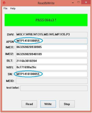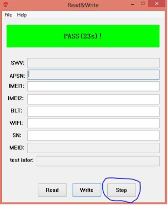 11. Программа зальёт данные на телефон и вы снова увидите статус PASS, нажмите STOP в программе. После чего отключите устройство и ещё раз передёрните батарейку (если это возможно), включите устройство и проверьте восстановился ли IMEI.