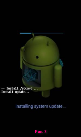 5. Выберите пункт apply update from sdcard, а затем выберите прошивку в виде архива GBC_update.zip, после чего начнётся процесс прошивки (рис. 1, 2, 3).
