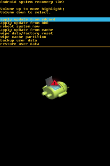 5. Дальше появится меню Recovery, через которое будем устанавливать прошивку. Для навигации по меню пользуемся кнопкой "звук +" чтобы выделить тот или иной пункт, а для его выбора кнопкой "звук -".