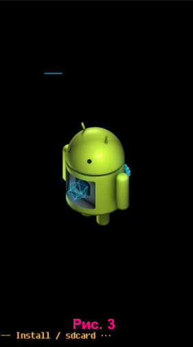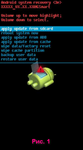 5. Для того чтобы передвигаться по меню используйте кнопку увеличения звука, а для выбора пункта используйте кнопку уменьшения звука. Выберите apply update from sdcard (см. рис. 1).