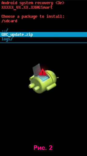 6. Дальше выбираем нашу прошивку в виде zip архива, которую мы скопировали на память смартфона раньше, то есть GBC_update.zip (см. рис. 2) и подтверждаем выбор при помощи кнопки уменьшения звука. Дальше начнётся прошивка (рис. 3).