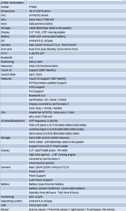 Elephone P7000 Pioneer - еще одно относительно недорогое устройство от Elephone, с характеристиками которые явно не соответствуют цене, в лучшую сторону конечно. P7000 Pioneer позиционирует себя как флагманское устройство, как снаружи так и внутри. Корпус устройства изготовлен из металла и пластика, если быть более точным, то рамка вокруг корпуса металлическая, а задняя крышка из пластика. "Сердцем" смартфона стал новейший 64-битный чипсет MediTek MT6752 с 8-ядерным процессором на тактовой частоте 1.7 ГГц. Устройство так же получило большой IPS дисплей с диагональю в 5.5 дюймов и разрешением Full HD, за защиту от трещин и царапин которого, отвечает Corning Gorilla Glass 3. Оперативная память так же соответствует другим внушительным характеристикам смартфона. Elephone P7000 Pioneer имеет целых 3 Гб оперативной памяти LPDDR3 на частоте 800 МГц. А вот внутренней памяти не так много, для флагманского устройства, а именно 16 Гб, однако есть возможность расширения внутреннего хранилища за счёт карты microSD объёмом до 64 Гб. На тыльной стороне смартфона расположилась камера от Sony на 13 Мп с апертурой f/2.0, а так же сканер отпечатков пальцев, прямо под объективом. Ёмкость батареи тоже радует, целых 3450 мАч. Смартфон поддерживает LTE частоты стран СНГ, имеет USB OTG и работает на Android 5.0 Lollipop.