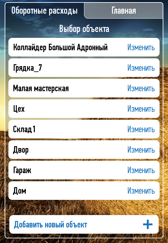 Интуитивно и привычно разделите статьи расходов-доходов по тем объектам, к которым они относятся. Например «Машина», «Дом», «Цех», «Мастерская». Если у Вас приусадебное хозяйство, можете назвать объекты «Грядка №4», «Огурцы от соседки», в общем как угодно. Для малого бизнеса также нет никаких ограничений – «Склад нового клиента», «Центральный склад», «Ящик под столом у бригадира». И не менее удобно называйте операции прихода и расхода. Добавляйте столько записей к каждому объекту, сколько посчитаете нужным и очевидным.