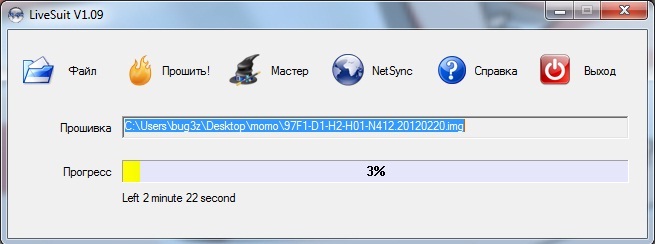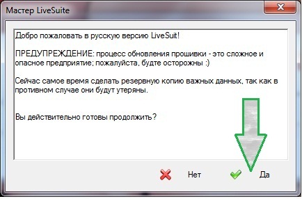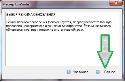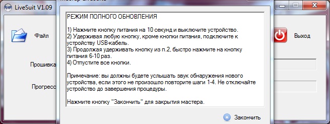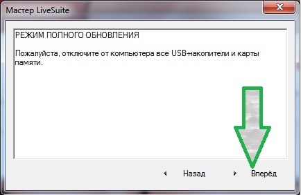 3. Запускаем LiveSuit.exe. Выбираем "Да", затем "Полное", затем "Вперёд". Затем выбираем файл прошивки куда она была распакована (прошивка это .img файл большого размера, около 200 Мб, находится в одной из папок которые были распакованы из архива с прошивкой)