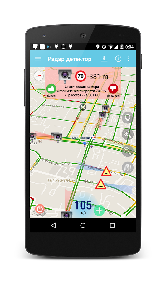 Бесплатное приложение для обнаружения камер скорости на дороге (мобильные засады, статические камеры, камеры встроенные в светофоры), лежачих полицейских, плохих дорог и прочих опасностей.