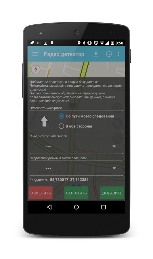 Данное приложение работает иначе, оно использует базу данных опасностей, обнаруженных ранее другими пользователями. Например, если приложение сообщило о мобильной засаде, то это означает, что в этом месте вероятно может быть мобильная засада.