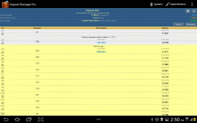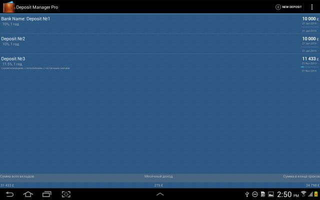 Депозитный Менеджер — это депозитный калькулятор, который позволяет рассчитать доход от различных вариантов банковских вкладов, сохранить в своем смартфоне данные о вкладах, вести точный учет сбережений и прогнозировать будущий доход.