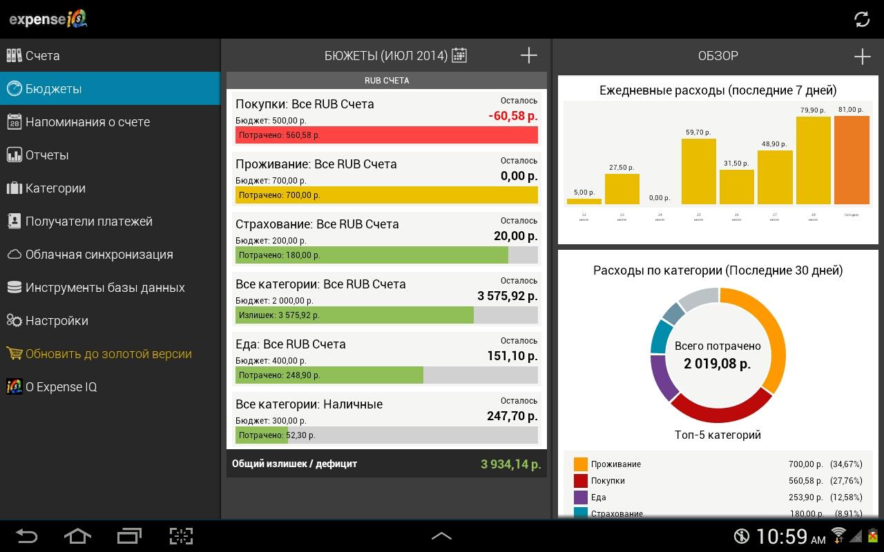 Чтобы эффективнее управлять своим бюджетом необходим планировщик бюджета, который быстро и легко отслеживает все ваши расходы. Интегрированный в Expense IQ менеджер расходов позволяют устанавливать месячные бюджеты для специальных счетов и/или категорий и следить за ними с помощью цветной шкалы здоровья, которая предупреждает о превышении бюджета.