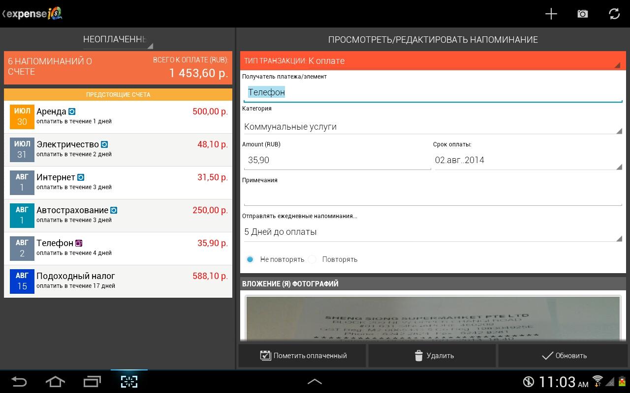 Приложение также включает интегрированное напоминание о счетах, которое помогает избегать неприятных комиссий за просрочку с помощью своевременных напоминаний о необходимости оплаты счетов. Вы даже можете сфотографировать свои квитанции и счета для хранения цифровой записи.