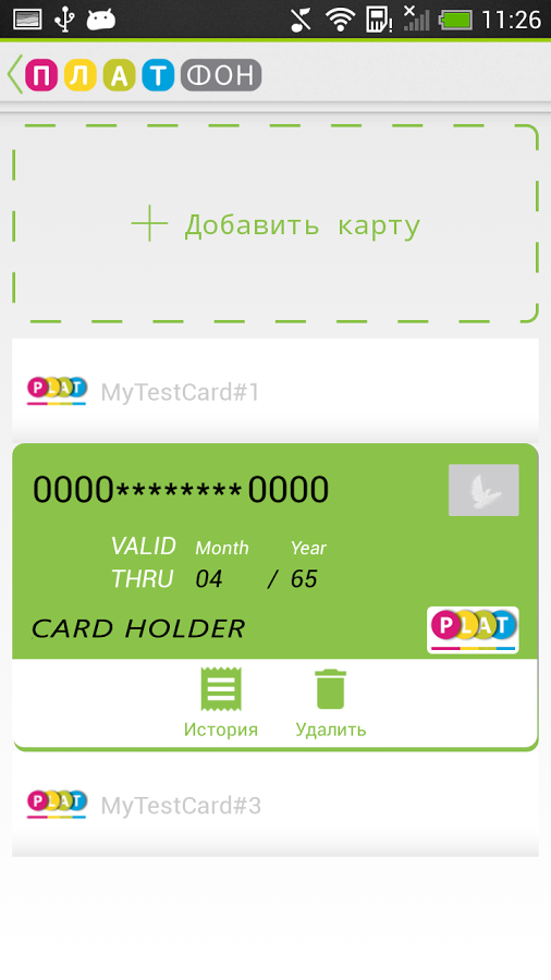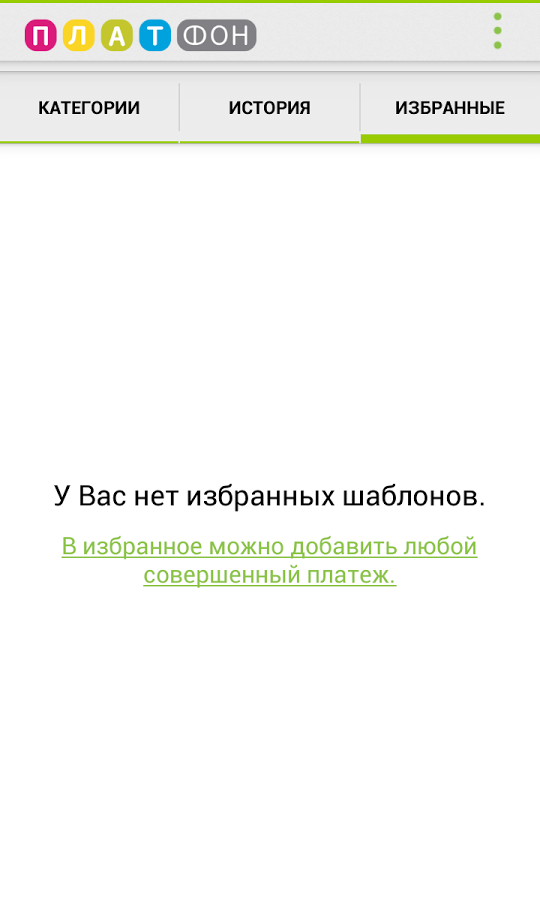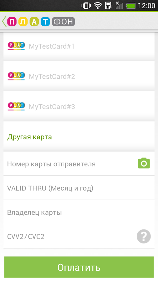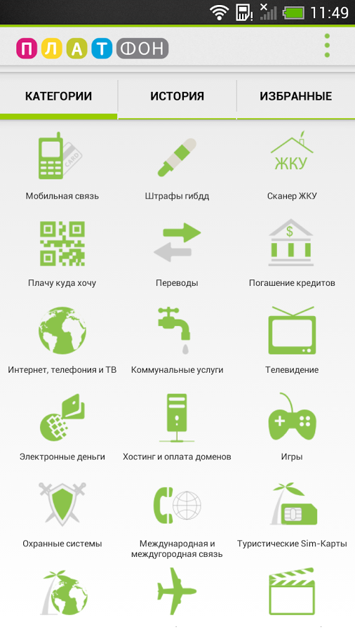 ПЛАТфон предоставляет своим клиентам широкий выбор платежных сервисов по оплате повседневных услуг: пополнение счета мобильного телефона, оплата счетов и квитанций ЖКУ, погашение кредитов в любом банке, оплата штрафов ГИБДД, платежи по свободным реквизитам, денежные переводы и многое другое, всего более 3000 услуг для различных регионов России. Оплачивать услуги можно с карты Visa Master Card (и т.д.) любого банка (принимаются виртуальные карты) из платежного приложения ПЛАТфон для мобильного телефона или воспользоваться деньгами на счету мобильного телефона, что обеспечивает высокую доступность и мобильность услуг.
