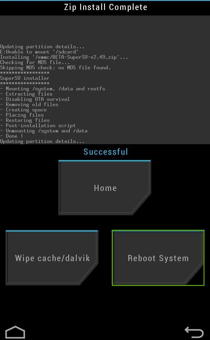 4. Получаем root. Для этого скачиваем из вложения к посту архив BETA-SuperSU-v2.49.zip, помещаем его в корень памяти устройства. Загружаемся в TWRP recovery (выбрать в меню загрузчика Boot to Recovery mode) и устанавливаем этот архив (выбрать пункт Install -> далее архив BETA-SuperSU-v2.49.zip -> провести пальцем внизу экрана для его установки). Перезагружаемся в систему уже c root'ом выбрав в рекавери пункт Reboot system.