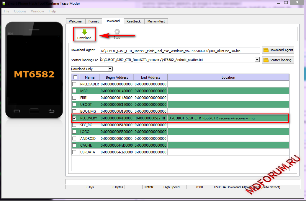 4. Нажимаете кнопку Download и подключаете выключенный телефон, если с драйверами всё ОК, тогда прошивка рекавери начнётся автоматически.