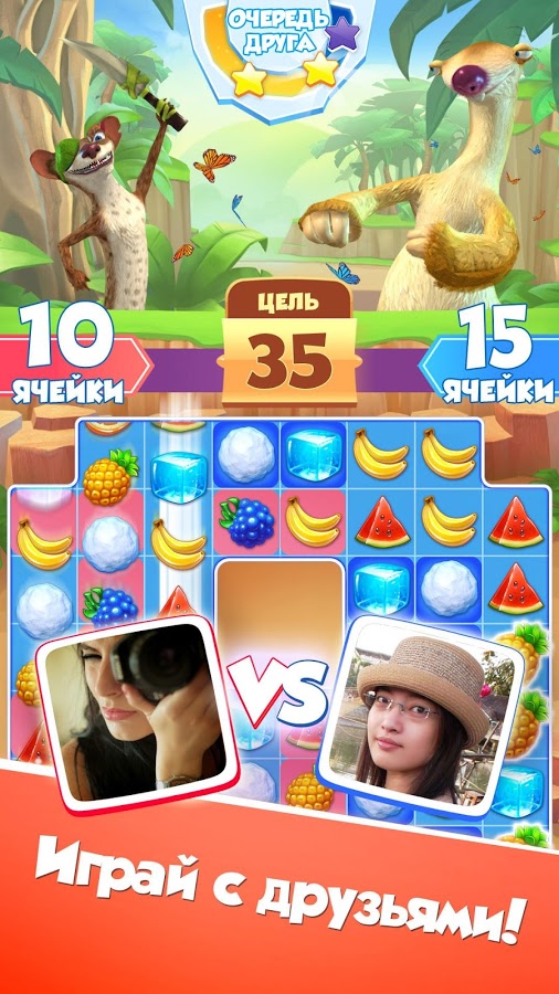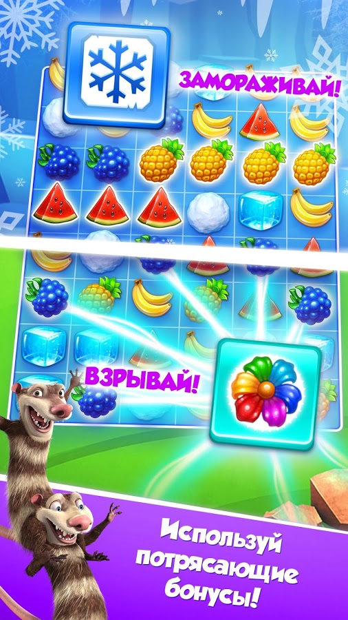 Ice Age Avalanche – всеми полюбившийся мультик вновь оказывается на экранах ваших мобильных android девайсов в виде отличной казуальной игры, которая поможет вам приятно скоротать своё время. Игра представляет собой жанр «три в ряд», но обладает своими фишками и особенностями. Смысл игры как и во всех играх этого жанра сводится к тому чтобы передвигать фрукты так чтобы они собрались в один ряд, как только три и более одинаковых фрукта соединятся они исчезнут. Вступайте в сообщества и не пропускайте еженедельные акции с возможностью получить интересные призы. Приятной игры!
