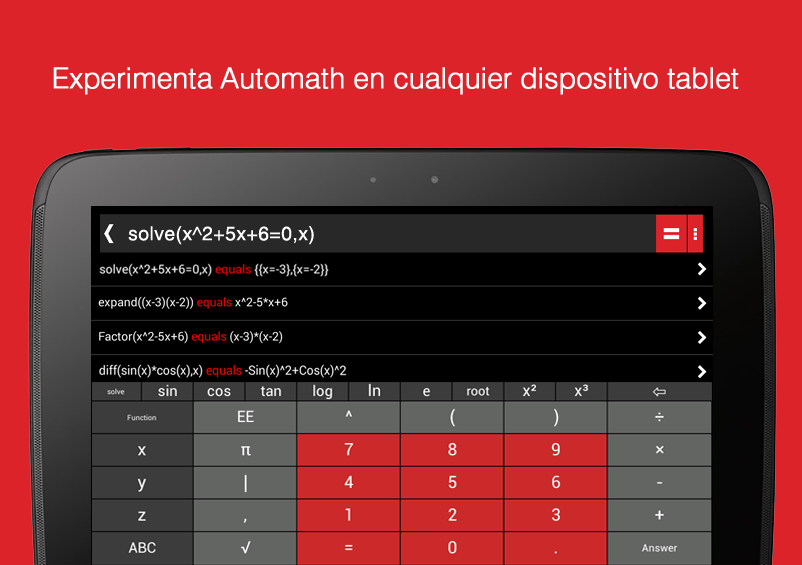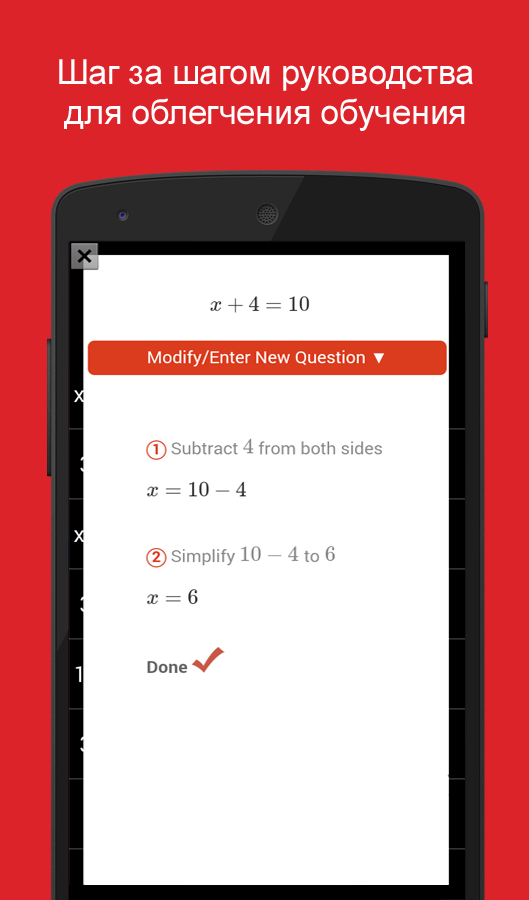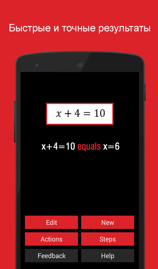 - Решение как простых, так и сложных примеров (сложение, вычитание, умножение, дроби, деление, неравенства, квадратные корни, тригонометрические выражения, уравнения, упрощения многочленов и т. д.)