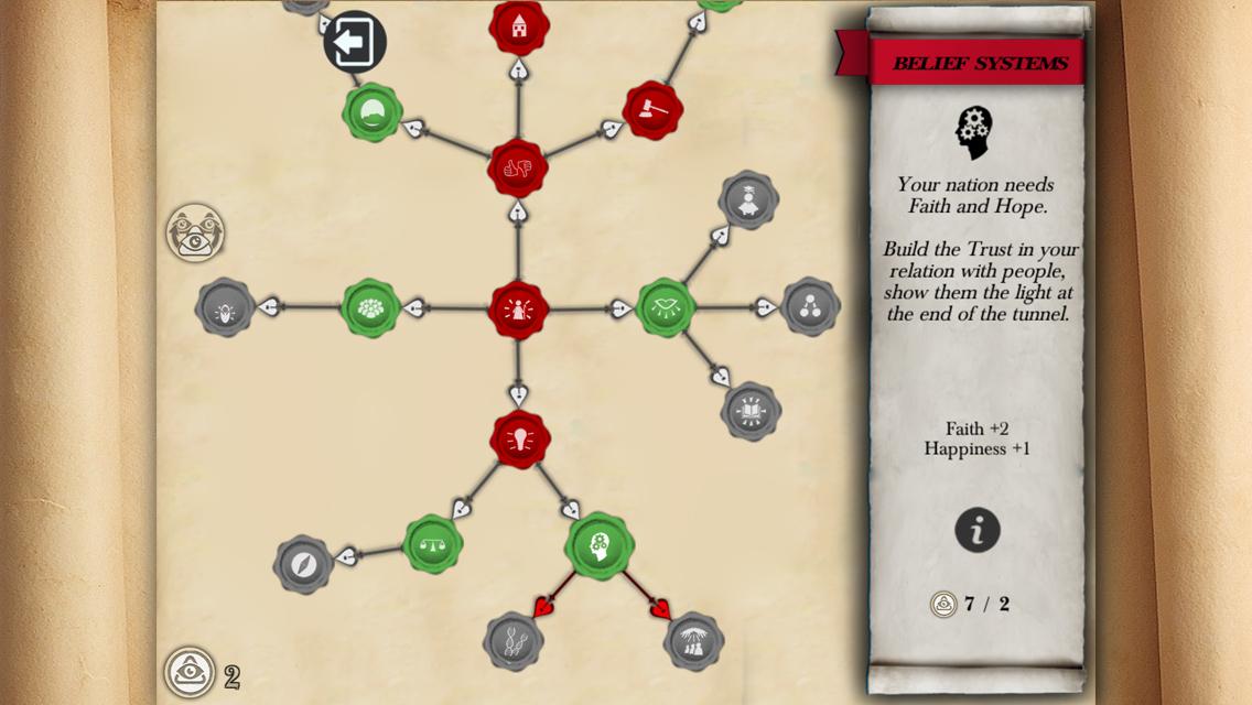2. ДЕРЕВО РЕШЕНИЙ - философия в основе каждой религии. В Religion Simulator вы можете решить, об отношении религии между верующими и Богом. Вы можете выбрать, какие элементы в религии главное - вера, гласность, знания или, может быть, счастье? Создайте свою собственную систему веры, чтобы достичь более широкой аудитории. Определите ограничения, законы и формы наказания. Есть масса способов доминирования в мире, у тебя какой?