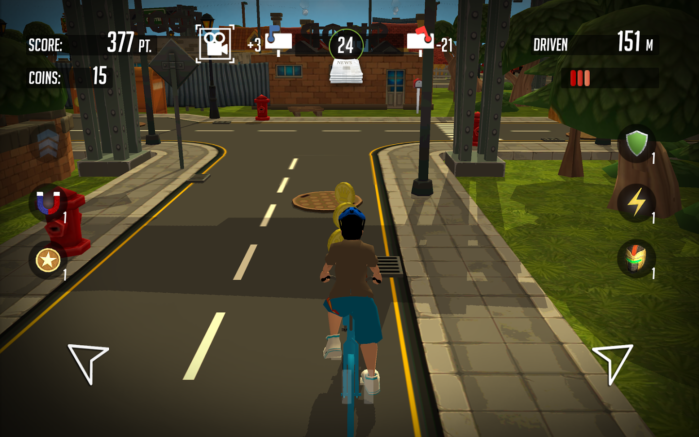 Paper boy: Infinite rider – станьте разносчиком газет в этой игре и доставляйте корреспонденцию в почтовые ящики горожан. В этой игре вы будете управлять героем, ездящим на велосипеде и закидывающим газету в почтовые ящики. Следите за указателями, показывающим вам маршрут, по которому вашему велосипедисту необходимо двигаться и кидайте газеты только в синие ящики. За каждую правильно доставленную газету вы будете получать деньги, а также собирайте монетки по пути следования и бонусы в виде усилений, брони и магнитов. На собранные деньги улучшайте велосипед героя или покупайте новый. Игра порадует вас отличной яркой графикой и многочисленными бонусами.