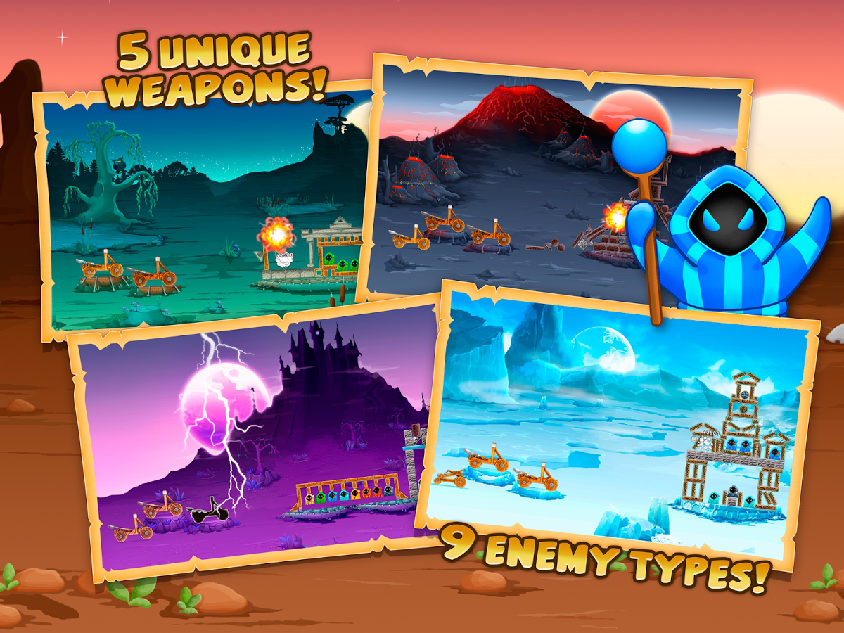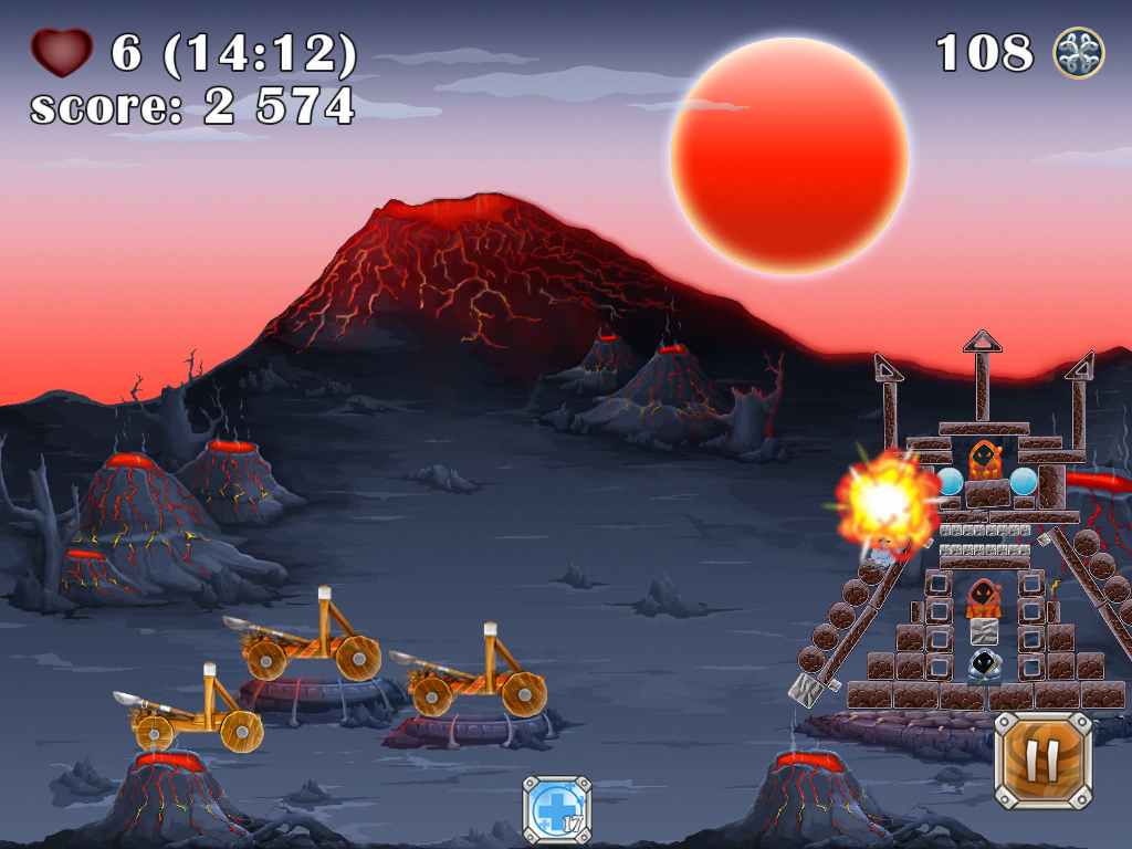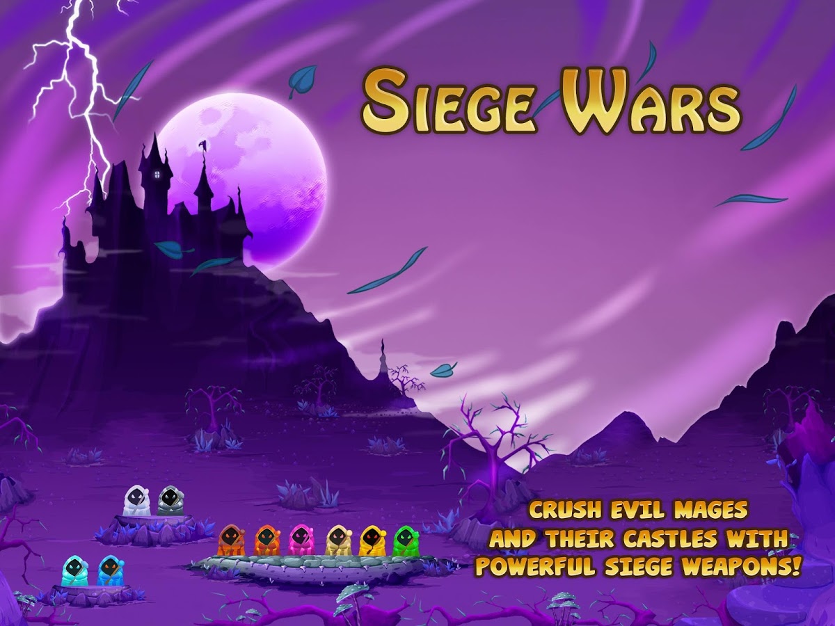 Siege Wars - дайте отпор магам, которые поработили людей с помощью катапульт. Люди тысячелетиями страдавшие от натиска магов восстали, применяя научные знания, собрали катапульты, баллисты и требушеты для осады дворцов магов. Запускайте с помощью катапульты снаряди и разрушайте дворцы, при этом остерегайтесь магии которую применяют ваши враги. Пройдите все 80 неповторимых уровней в трех мирах и уничтожьте все вражеские дворцы с их обитателями. В игре вас ждут более 10 различных магов, которые обладают уникальными свойствами для защиты. Применяйте различные бонусы в виде магических щитов и по ходу игры улучшайте ваше оружие и боеприпасы.
