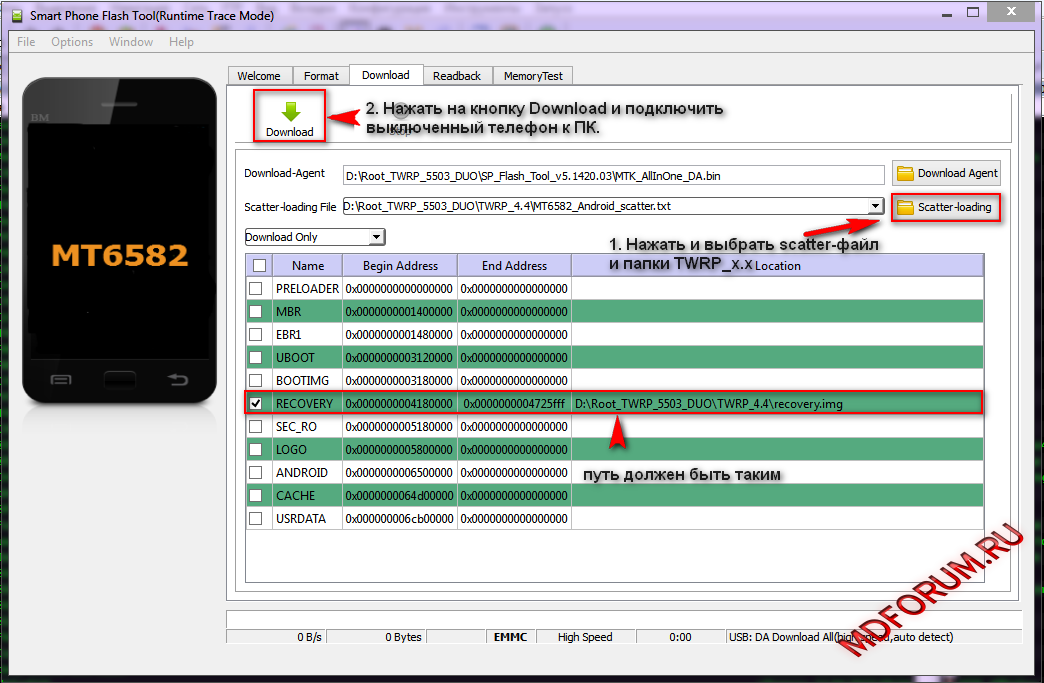 5. В окне программы нажать на кнопку scatter-loading и выбрать файл MT6582_Android_scatter.txt из папки TWRP_4.4 или TWRP_4.2 в зависимости от того, прошивка какой версии Android у вас установлена в данный момент.