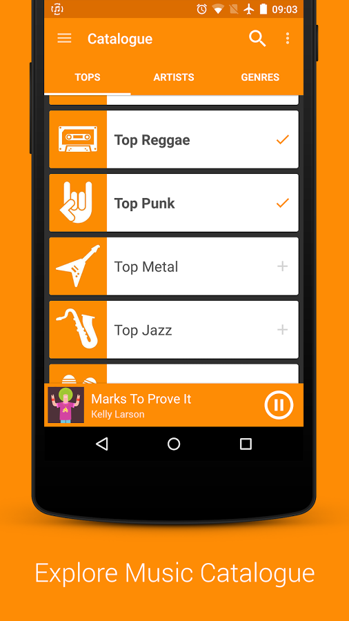 Поиск треков может осуществляться по исполнителям, жанрам и даже географической принадлежности. Из предложенной фонотеки можно создавать собственные плейлисты и сохранять их для прослушивания офлайн. Кроме собственно каталога, приложение включает простенький плеер с набором основных функций.