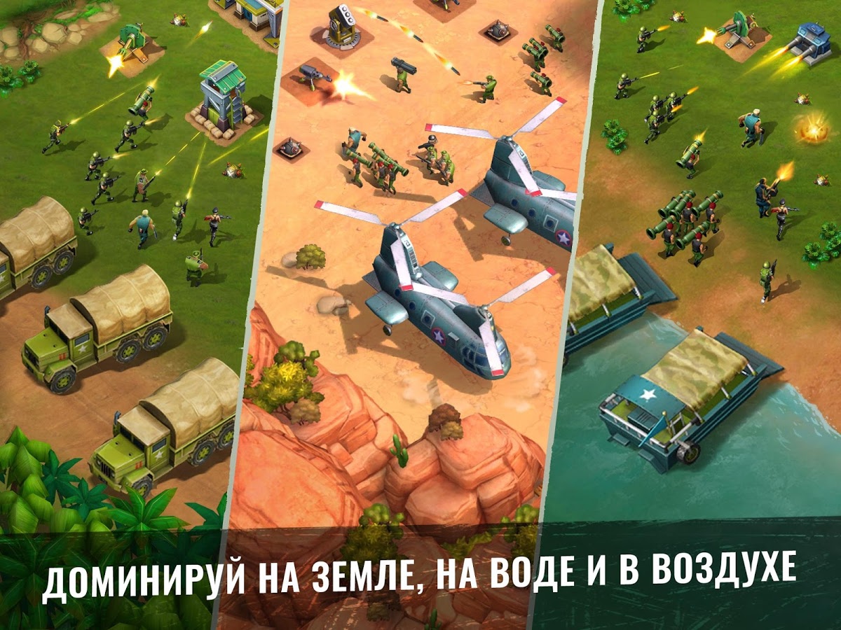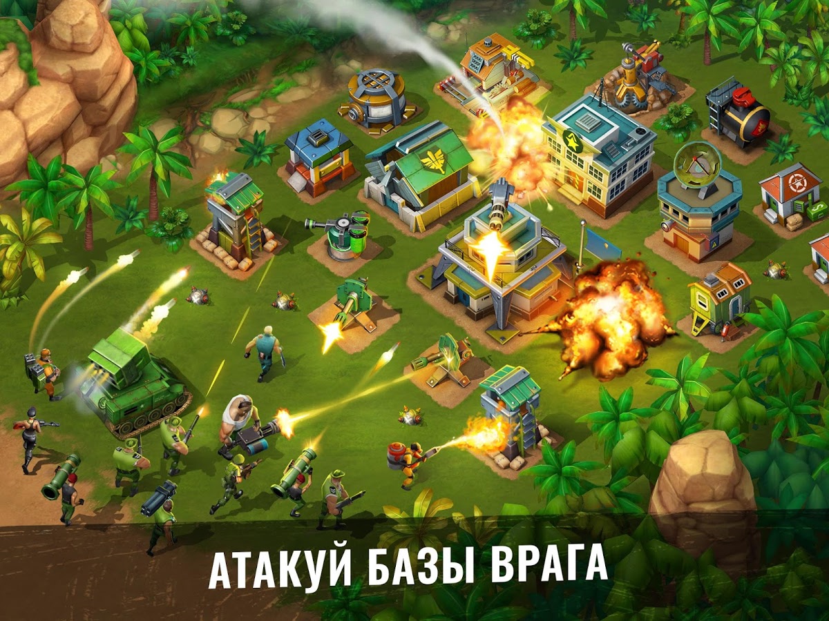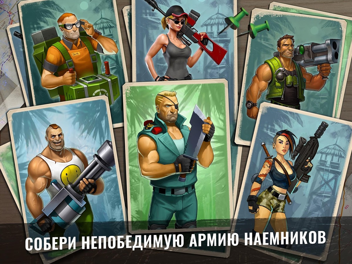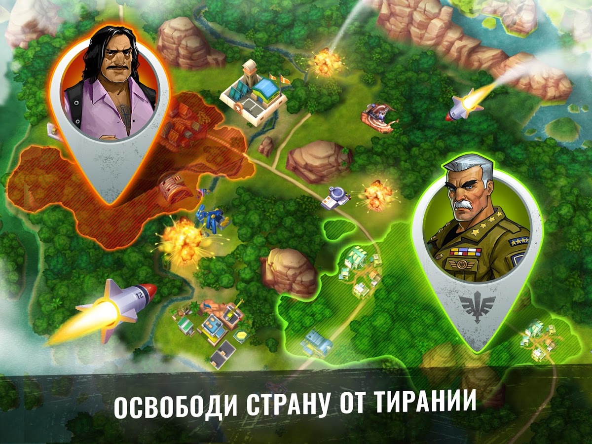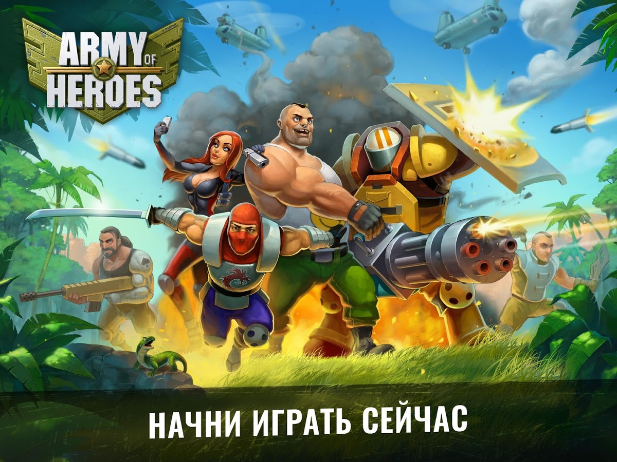 Army of Heroes – станьте настоящим революционером в этой игре на андроид, и свергните диктатора захватившего власть в тропической стране. Вашей главной задачей будет создать свой военный пост и превратить его в огромную базу. Соберите свою армию героев, состоящую из наемников: сумасшедшего пулеметчика, ученого, снайпера и других и высаживайтесь на вражеских базах, используя вертолеты, катера и грузовики. Станьте опытным главнокомандующим и полностью контролируйте свою армию, постоянно меняя цели для атаки. Разрабатывайте свою тактику ведения боя с запрещающими приемами такими как: бомбежка криобомбами и разбрасывание пропагандистские листовки. Захватывайте ключевые объекты в городе: аэропорты, нефтяные вышки, больницы и лаборатории и диктуйте свои правила захватчикам. Прибегайте к помощи друзей сражайтесь с ними бок о бок.
