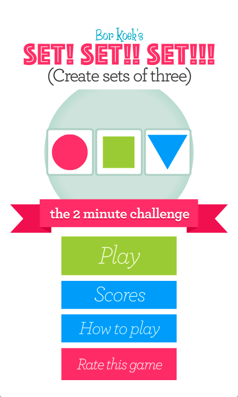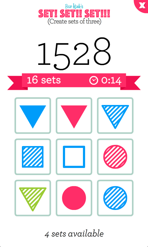 Set Set! Set!! – игра головоломка на андроид, в которой вы потренируете свой мозг и весело проведете свое свободное время. В этой игре вашей главной задачей будет собирать геометрические фигуры так, чтобы они были одинаковые по форме, либо по цвету или штриховке. Попробуйте собрать как можно больше совпадений и заработать максимальное количество очков. Тренируйте свой мозг, реакцию и скорость мышления и поборитесь со своими друзьями за лучшие результаты. Делитесь своими достижениями в Twitter и поставьте свой собственный рекорд в этой игре. Играйте, и с пользой проводит свой досуг.