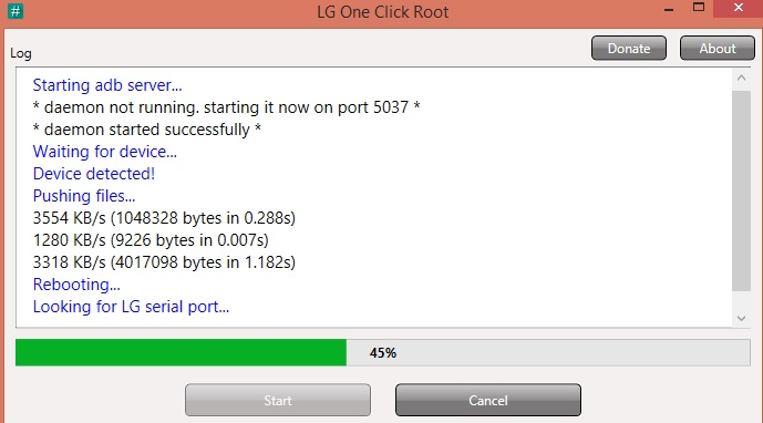 5. Запустить LG One Click root и нажать Start. Если на смартфоне выскочит окошко с запросом на предоставление отладки по USB для этого компьютера -> поставить галочку на против пункта "always allow from this computer" и нажать OK.