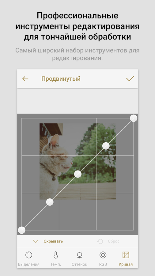 Большинство функций и инструментов знакомы нам по программам-конкурентам: реалистичный HDR, таймер, стабилизатор, серийная съемка и многое другое.