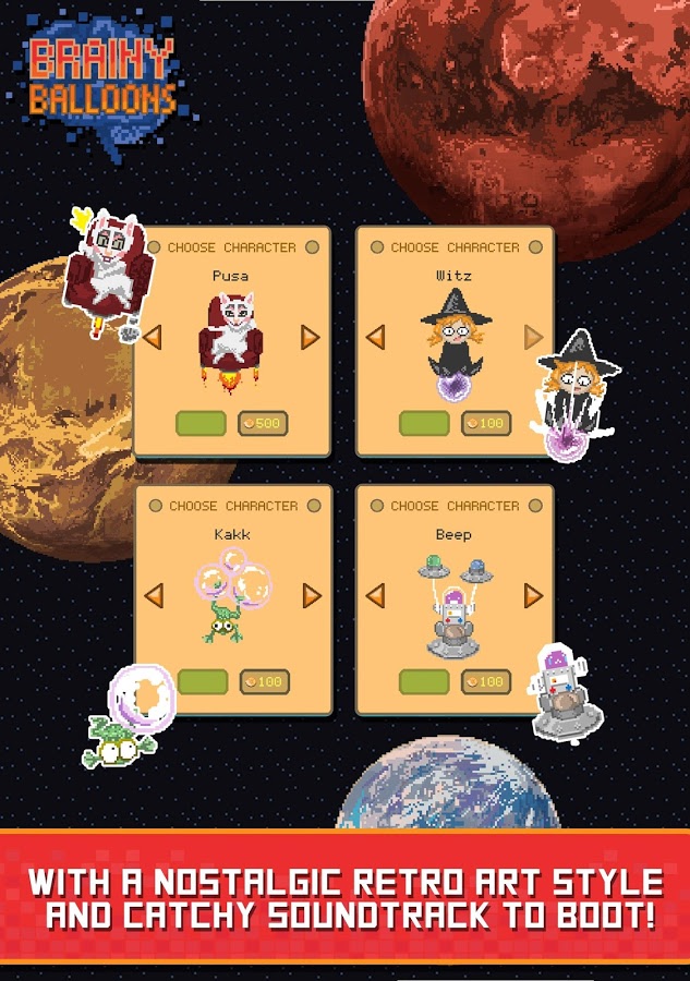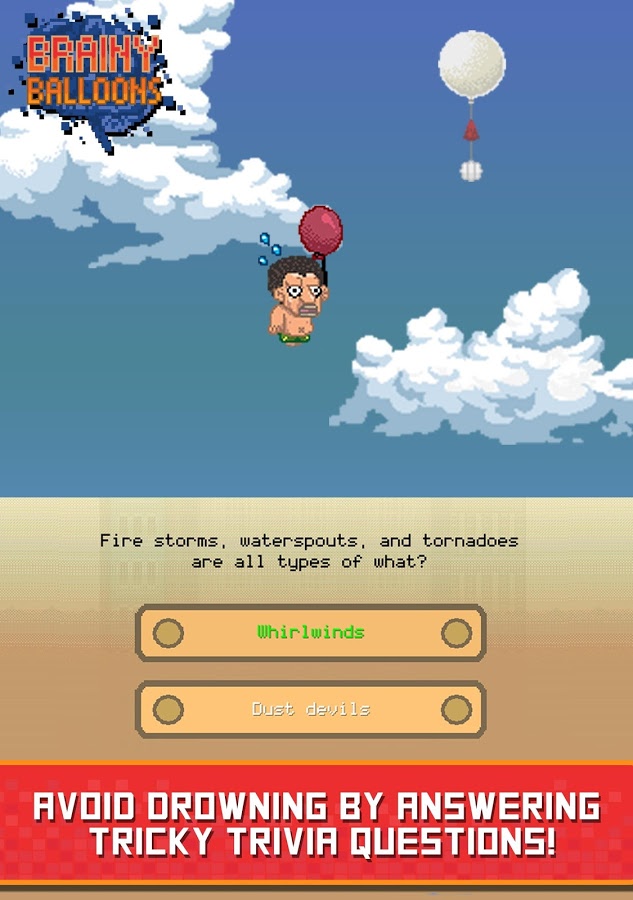 Brainy Balloons - игра, сочетающая в себе элементы ранера и интеллектуальной викторины. Дело в том, что пиксельный мир, в котором живет ваш персонаж, под угрозой затопления, и единственный способ спастись от постоянно поднимающегося уровня воды - забраться повыше. Наш герой, взяв в руки воздушные шары, начал свое восхождение, но для того чтобы подниматься выше ему необходимо отвечать на всевозможные вопросы, о деталях сюжетной сюжетной линии разработчики умолчали и видимо оставили этот момент додумывать игрокам. Вопросы задаваемые герою из различных сфер жизни начиная от истории и заканчивая поп - культурой. Конечно же не обошлось и без элементов развития за достижение определенных высот вы будете получать призы в том числе возможность разблокировать дополнительных героев.