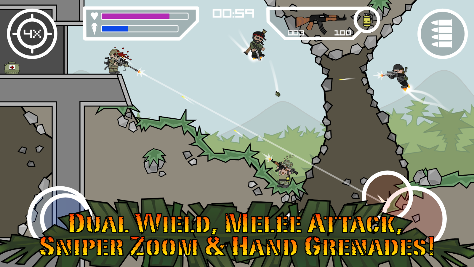 Doodle Army 2 : Mini Militia – продолжение увлекательной игры на андроид, где вы возьмете в руки оружие и будете прокладывать себе дорогу сквозь джунгли. Это многопользовательская игра, в которую смогут играть одновременно до шести человек. Включайте режим выживания и оттачивайте свои навыки владения различным оружием, таким как снайперская винтовка, дробовик и огнемет. Управляйте своим героем с помощью джойстика, расположенного на экране вашего телефона или планшета и открывайте для себя новые карты и локации. Применяйте специальные бонусы в виде реактивного сапога и летайте в течение длительного времени, уничтожая всех противников.