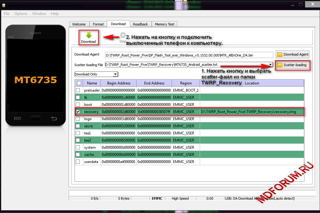 4. Запустить SP Flash Tool (flash_tool.exe). В окне программы нажать на кнопку scatter-loading и указать путь к файлу MT6735_Android_scatter.txt, который находится в папке TWRP_Recovery.