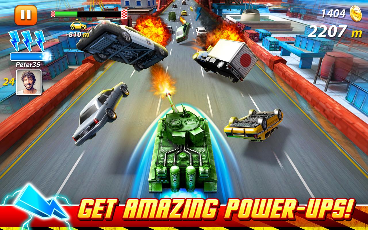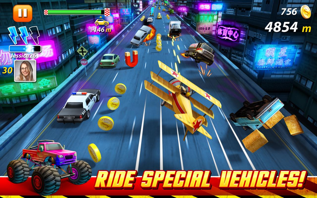 On The Run – садитесь за руль скоростного автомобиля и участвуйте в гонке с полицией. В этой игре вы будете нестись на огромной скорости по городским улицам, пытаясь оторваться от преследующей вас полицейской машины. В игре вас ждет море адреналина и бешеные скорости, развить которые вы сможете благодаря различным бонусам и усилениям. Гоняйте по оживленным трассам с бесконечным трафиком и собирайте по пути золотые монетки, которые помогут вам открыть новые более мощные автомобили. Управляйте различными транспортными средствами и совершайте головокружительные трюки и прыжки, а также прибегайте к помощи военной техники танкам и самолетам и совсем необычным НЛО.