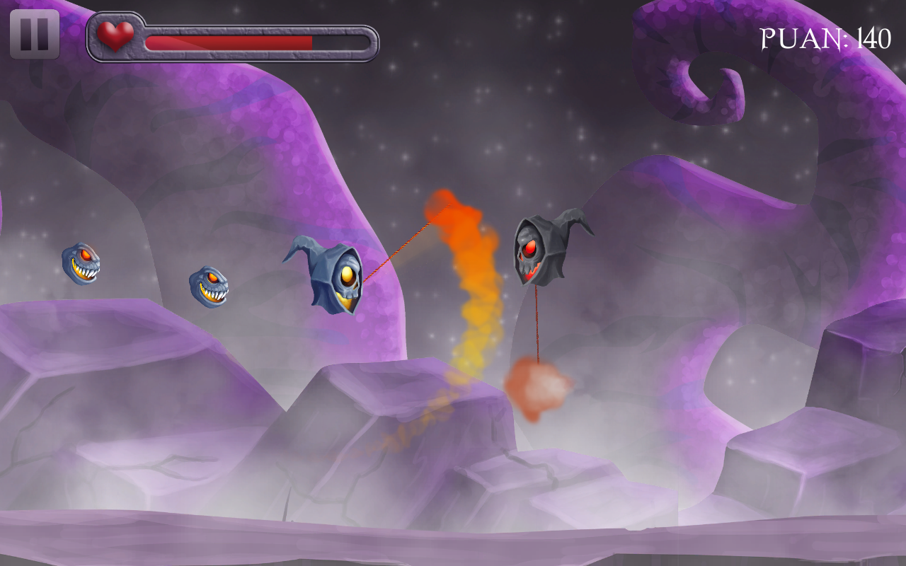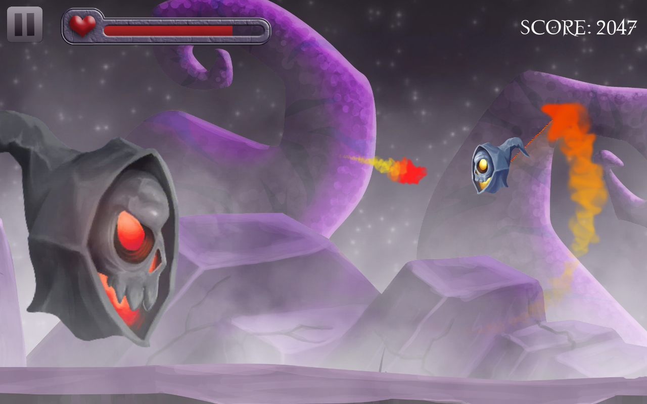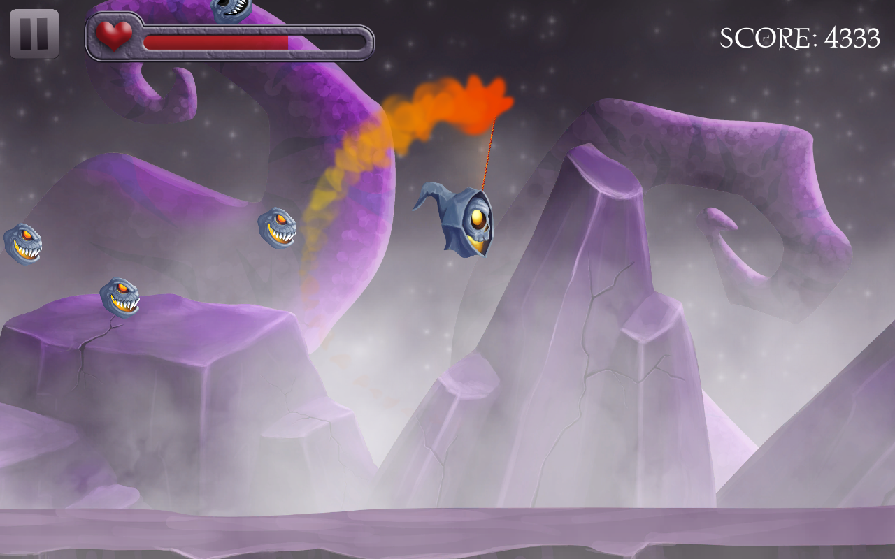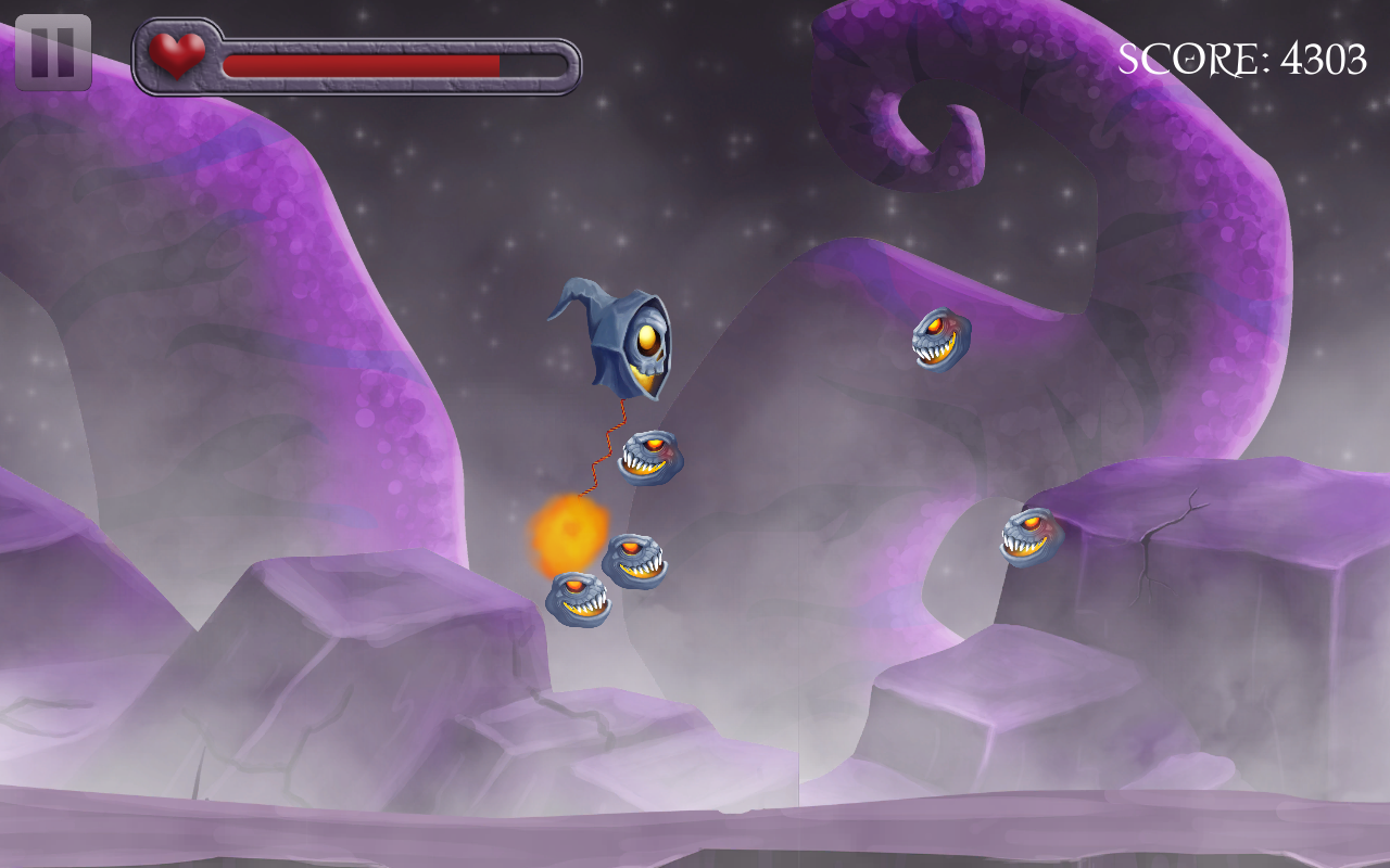 Alkekopter – управляйте летающим черепом и проведите его по опасным мирам, наполненным различными врагами. В этой игре вы будете управлять мистическим черепом, к которому на цепи прикован огненный шар, вам необходимо раскручивать его вокруг своей оси и тем самым уничтожать врагов которые захотят к вам приблизиться. Сбивайте всех своих врагов с помощью шара и собирайте по пути отличные бонусы, которые подарят вашему герою здоровье, дополнительный огненный шар и возможность замедлить врагов. С каждым новым уровнем сложность игры будет увеличиваться, добавятся боссы и непобедимые враги, которые захотят отобрать у вас бонусы.