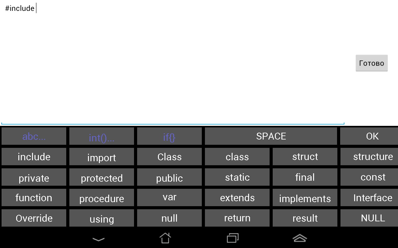 Здравствуйте коллеги. Не секрет, что кодить на мобильном устройстве то еще занятие. Однако в моей практике часто возникала необходимость что-то пробовать и писать коротенькие программы, пользуясь планшетом. Тот кто хоть раз пробовал писать код со стандартной клавы Андроида наверное также как и я испытывал немыслимые судороги, страшные мучения и желание разбить девайс о ближайшее дерево. В итоге я написал свою клавиатуру для кодинга. Конечно она была не в том виде, что сейчас, но с задачами справлялась. Пролежав в пыльных каталогах всяческих незаконченных проектов энное время, она попалась мне на глаза и была препарирована, облагорожена и приведена к более-менее приличному виду. В итоге получилось неплохое подспорье нам, кодерам.