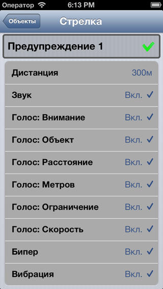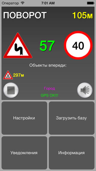 Программа отображает на экране объекты по ходу движения автомобиля, указывает тип, расстояние, вашу скорость и ограничение. Кроме этого выдает до трех звуковых и голосовых предупреждений об объекте по настроенным вами расстояниям. Также предупреждает вибрацией и бипером с изменяющейся частотой.
