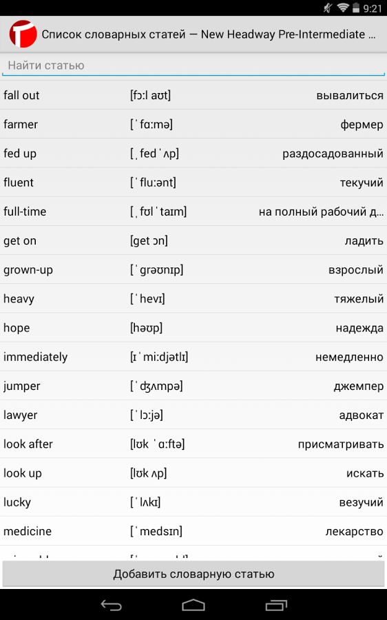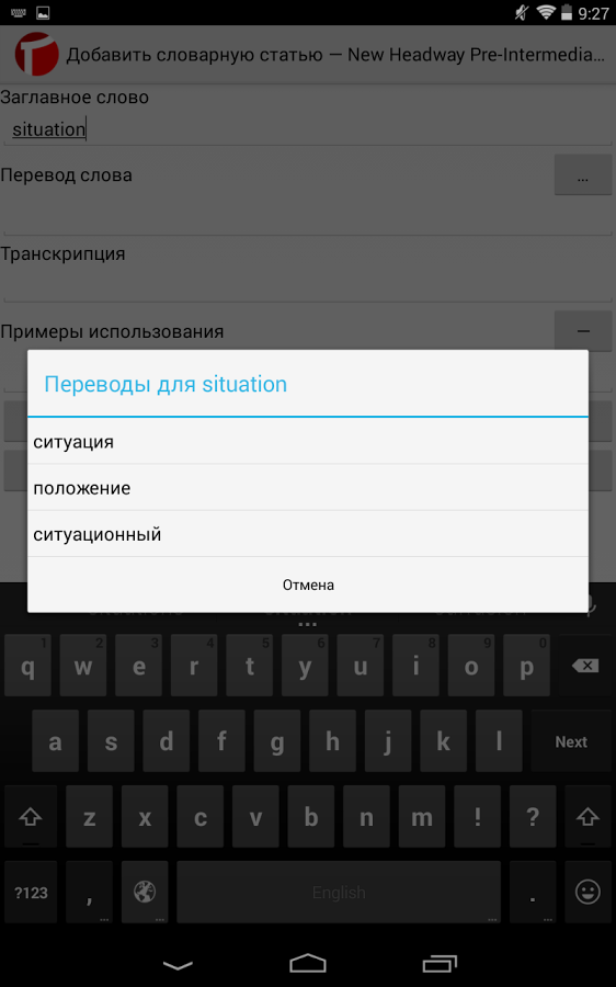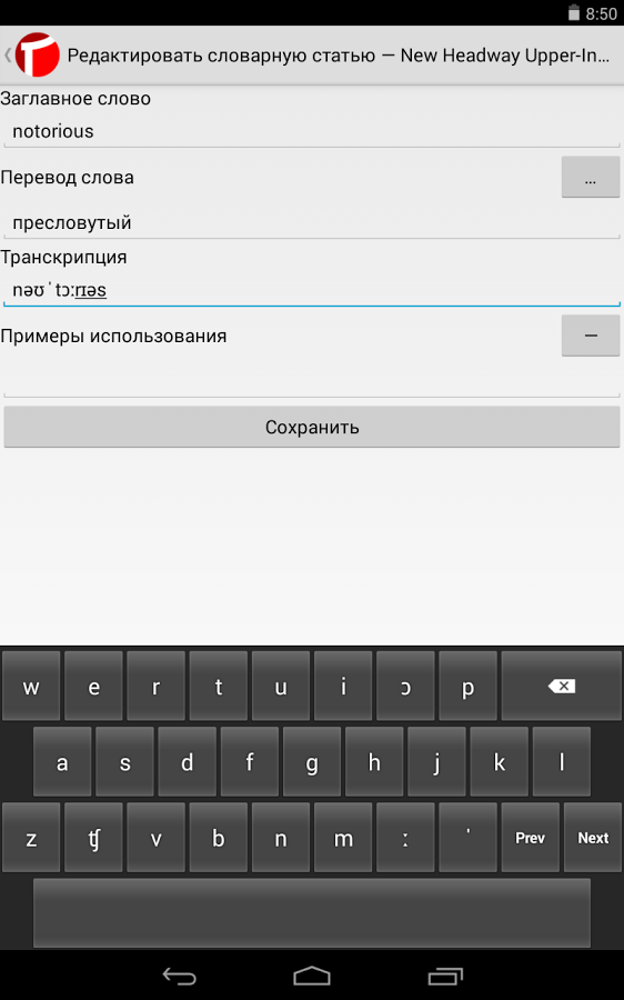 Редактирование собственных словарей. Словарная статья состоит из заглавного слова, перевода и необязательных транскрипции и примеров использования. Поиск перевода реализован с помощью сервиса «API «Яндекс.Словарь» (http://api.yandex.ru/dictionary/). Имеется кастомная клавиатура для ввода транскрипции слов английского языка.