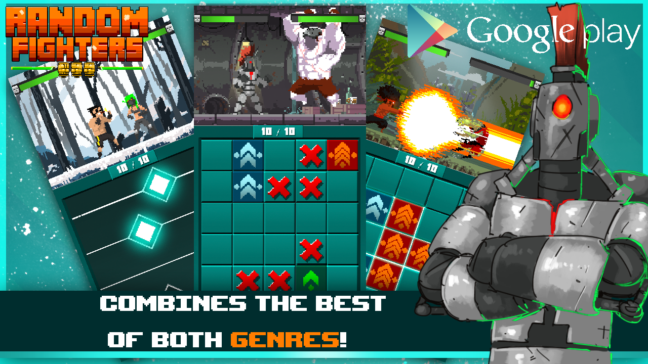 Random Fighters – с первого взгляда может показаться, что это файтинг, но это не совсем так. Игра скорее представляет из себя головоломку, в которой визуализация для лучшего восприятия игры сделана через файтинг. Игровое поле состоит из 25 ячеек, в котором вам необходимо создать необходимую комбинацию символов для атаки. Сделайте всё возможное для победы над вашим соперником, комбо удары и супер приёмы помогут в этом.