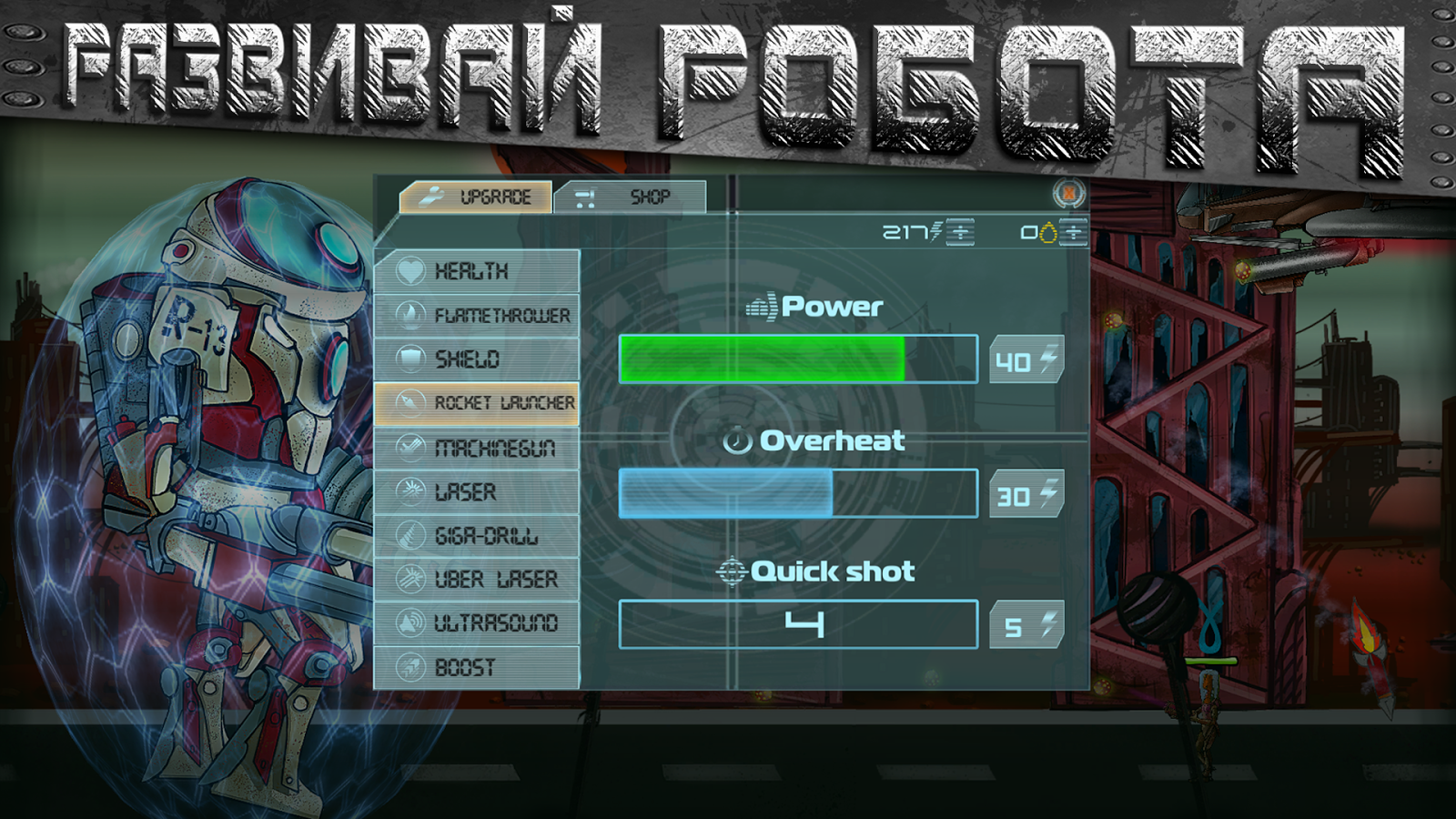 С помощью всесторонней системы прокачки, ты можешь сделать робота максимально подходящим под твой стиль игры.