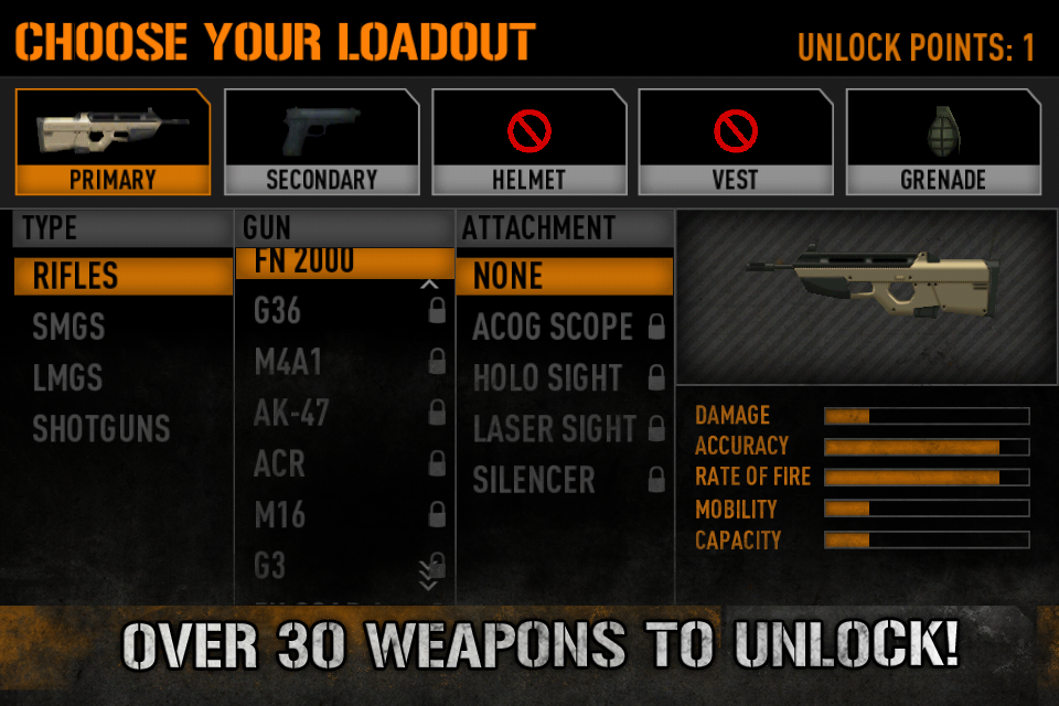 Более 30 различных видов оружия, брони и оборудования, включая пистолеты, винтовки, автоматы, гранаты и прочее!