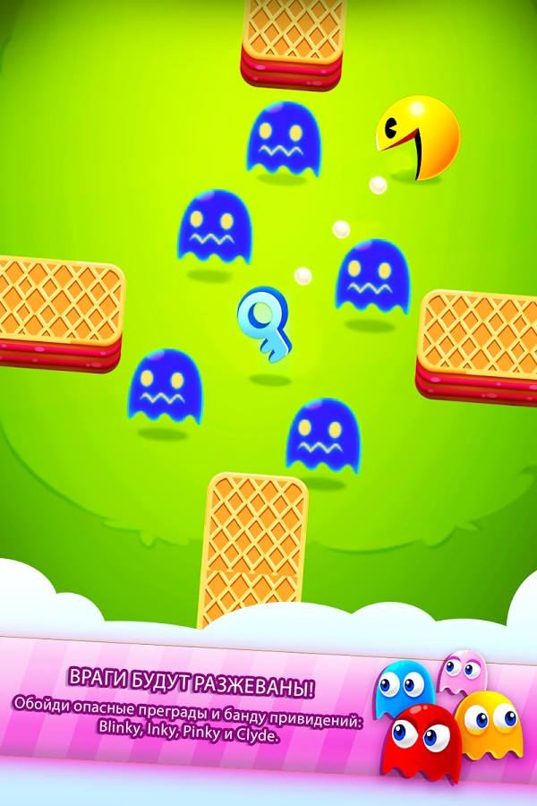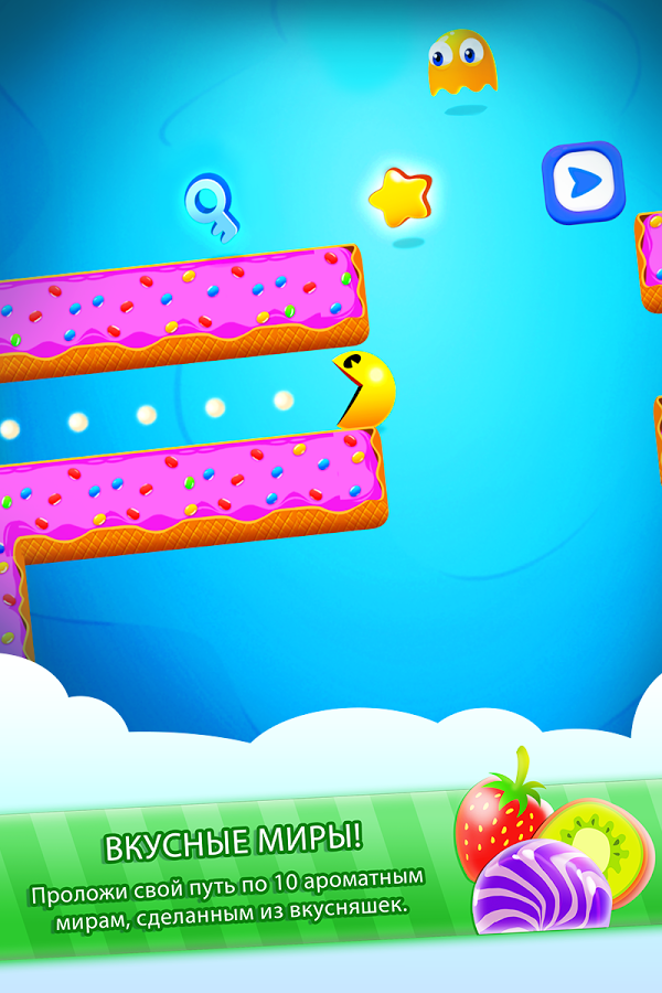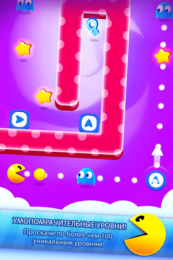 PAC-MAN Bounce – игра головоломка, в которой вы будете управлять PAC-MAN и проводить его по различным вкусным уровням. В этой игре вы сами будете управлять главным героем, рисуя ему путь с помощью пальца и делая это так, чтобы по пути собрать все фрукты и получить ключ на следующий уровень. Управляйте PAC-MAN и поедайте всех своих врагов, а также отскакивайте от стенок лабиринта и собирайте при этом труднодоступные звезды. Прибегайте к помощи всей своей логики и попробуйте пройти все 100 уровней с разными препятствиями и задачами. Игра порадует вас яркой графикой и разнообразными мирами.