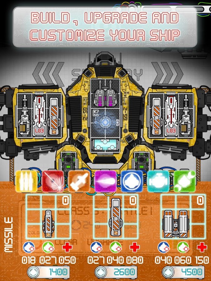 *Модернизируйте свой космический корабль и делайте его еще более смертоносным. Придумайте индивидуальный дизайн своего корабля, используя более 100 цветов и текстур