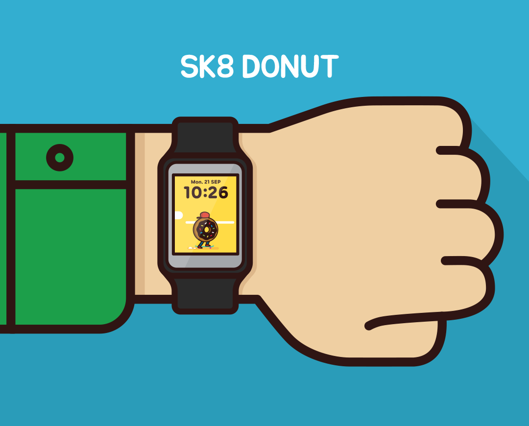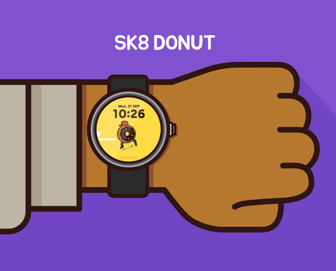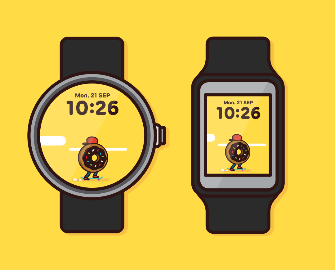 Пончик-скейтер на вашем запястье — это звучит так же абсурдно, как и выглядит. Но не спешите делать выводы об этом циферблате! Благодаря ярко-желтому фону и контрастному жирному шрифту текст на экране читается легко и всматриваться в цифры не приходится, а значит вам не придется тратить много времени, чтобы узнать, который час. Главное при этом не засмотреться на тот самый пончик, который будет весело рассекать по своим делам.