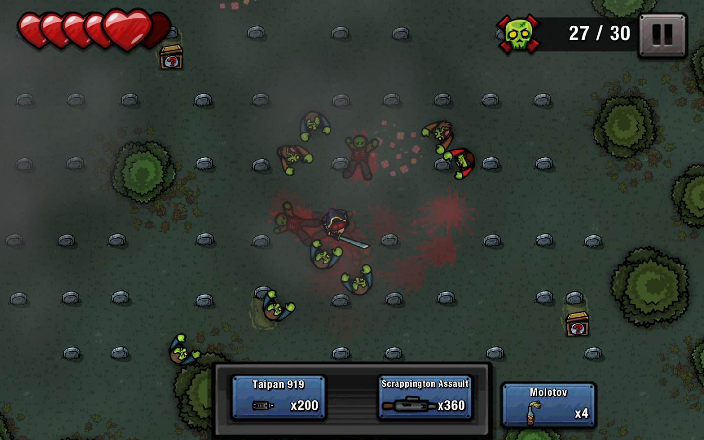 Zombie Scrapper - Интересная игра на выживание с 2D видом обзора. Попробуйте выжить, когда вы одни в доме и у вас в руках только одна бейсбольная бита, а к вам ломится огромное количество голодных зомби! Есть только один разумный вариант: выбраться из дома и искать одно из 34 видов оружия, что бы показать зомби кто тут главный!